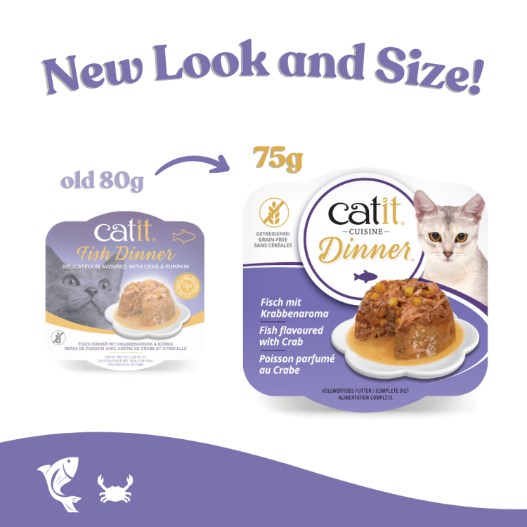 Catit Fish Dinner is a dual-layered wet food, made of fresh ingredients served in luscious gravy. This low-fat cat food is natural, high in protein and grain-free, with added vitamins and minerals for precisely balanced nutrition.