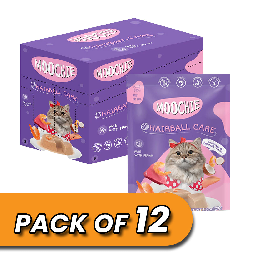 Opt for Moochie Cat Food Pate With Prawn - Hairball Care Pouch - 12x70g for a wholesome meal that not only tantalizes your cat's taste buds but also supports their health. Give your cat a delightful dining experience every day and watch them thrive!