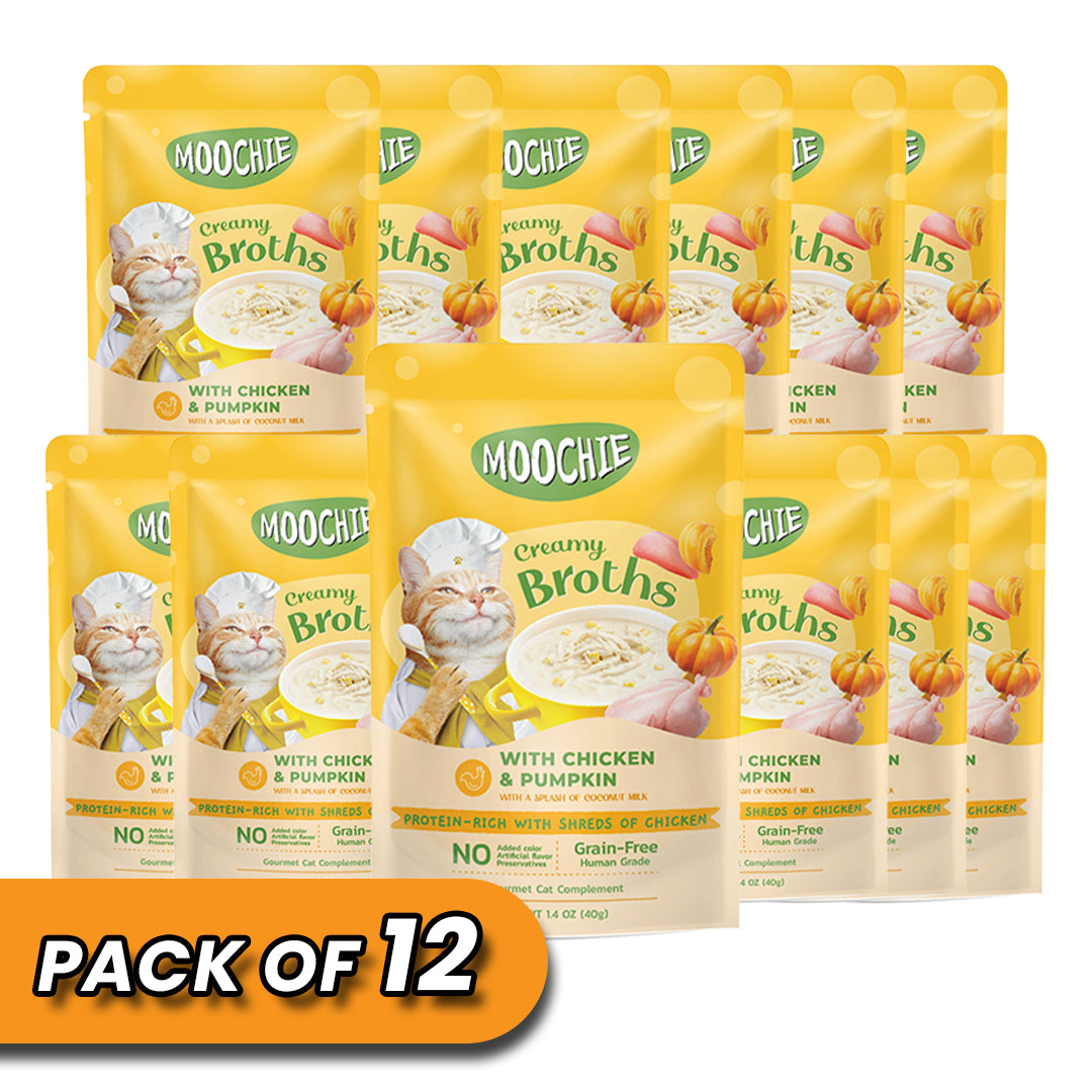 Elevate your cat's dining experience with Moochie Kitten Creamy Broth With Chicken & Pumpkin Pouch -12x40g, a meal that combines exquisite flavors and essential nutrients. Not only does it ensure health and happiness, but it also helps to create delightful moments during mealtime.