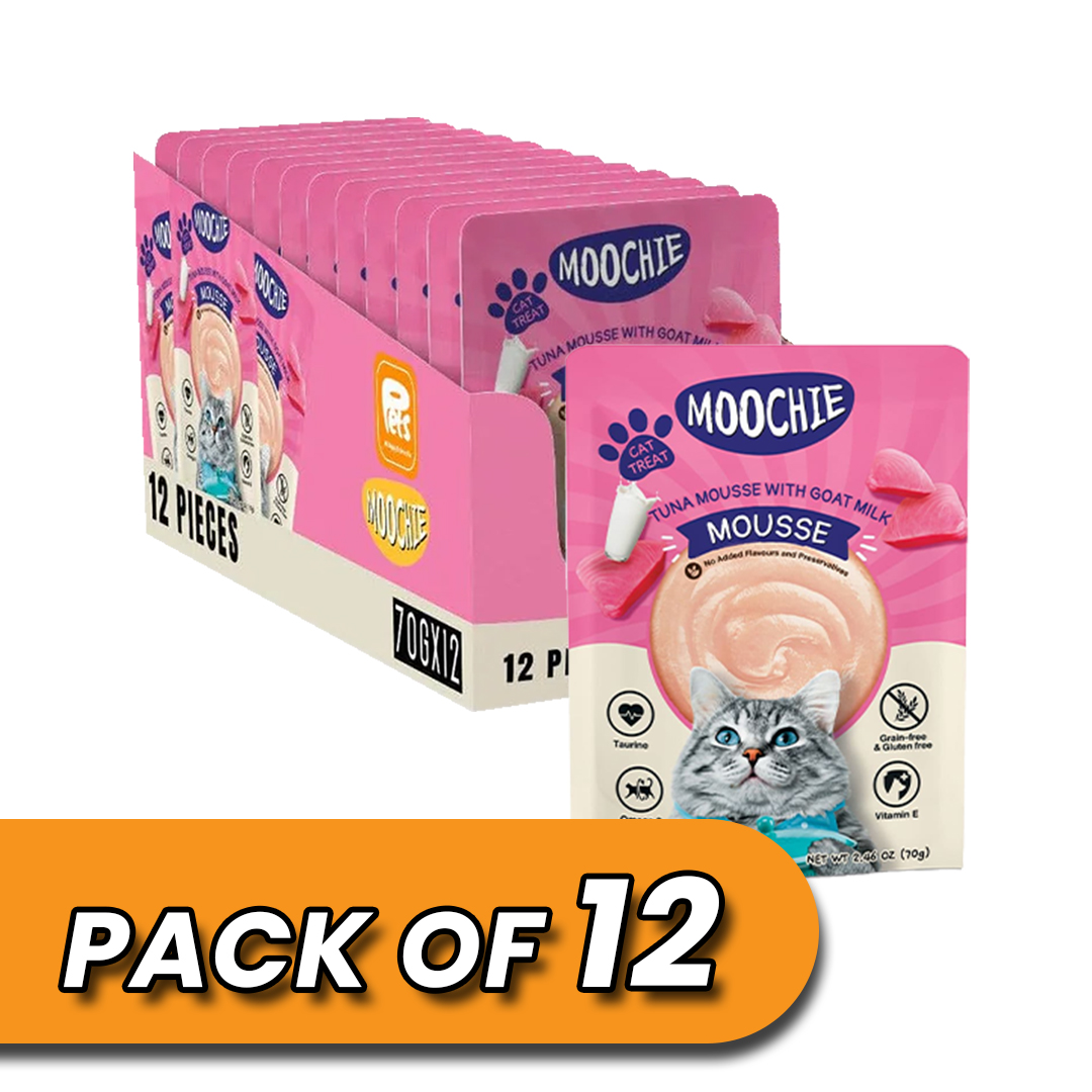 Choosing Moochie Wet Cat Food Tuna Mousse With Goat Milk Pouch -12x70g means treating your furry friend to a meal made from premium, human-edible ingredients. Not only is it delicious, but it is also designed to meet your cat's nutritional needs. Give your feline the gift of good health and happiness with every meal.