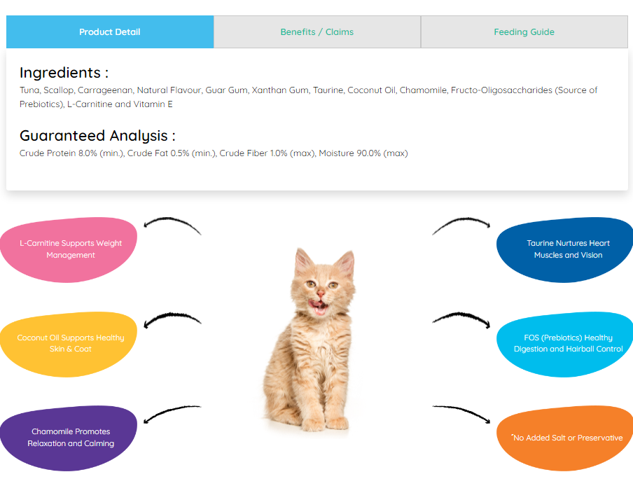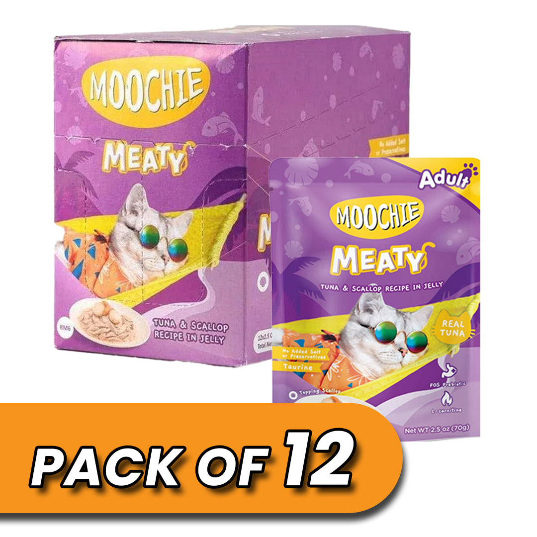 Every cat deserves a meal that’s not just delicious but also beneficial to their health. The Moochie Wet Cat Food Tuna & Scallop Recipe In Jelly Pouch -12x70g is perfect for picky eaters who enjoy a variety of textures and flavors. This wet food also provides hydration, helping to maintain your cat's urinary tract health.