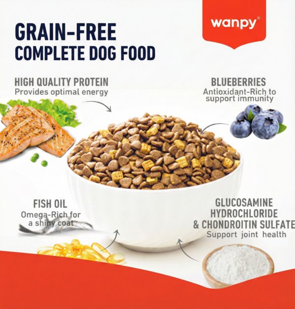 Formulated with high-quality salmon,Wanpy Grain Free Complete Food for Adult Dog Salmon Recipe provides essential amino acids and Omega-3 fatty acids to support healthy skin and a shiny coat. It is enriched with a balanced blend of vitamins, minerals, and antioxidants to help maintain strong immunity and overall well-being in adult dogs.